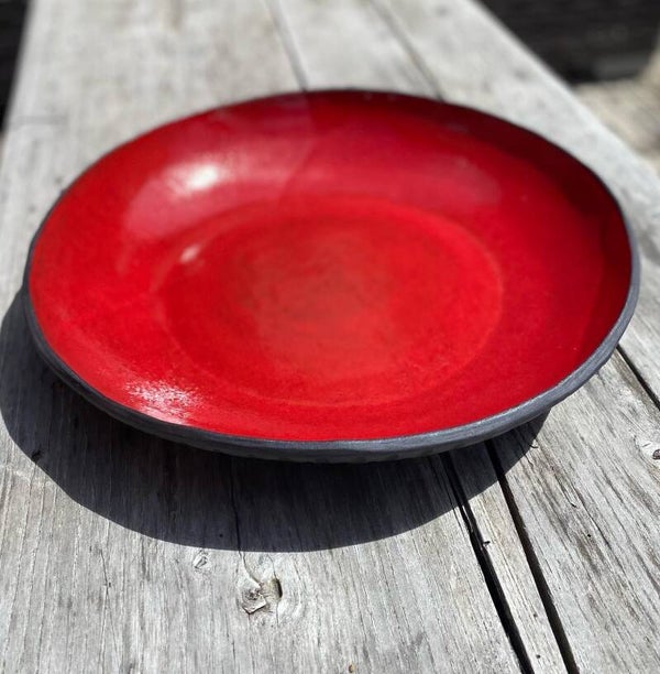 Grote schotel Pelagie XL gemaakt uit zwarte klei gecombineerd met vlammend rood glazuur. 38 cm diameterEen ware eye-catcher in jouw interieur!