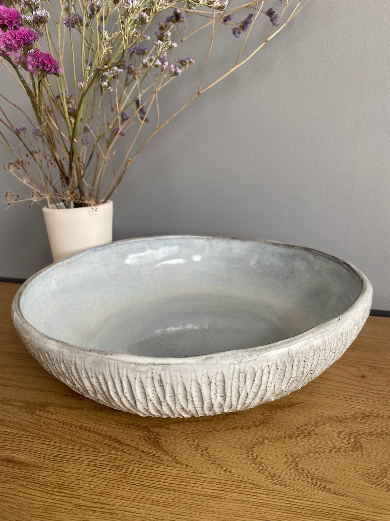 Schotel Pelagie M in zachte zandkleurige structuurklei en beige/witte glazuur. 30 cm diameter.