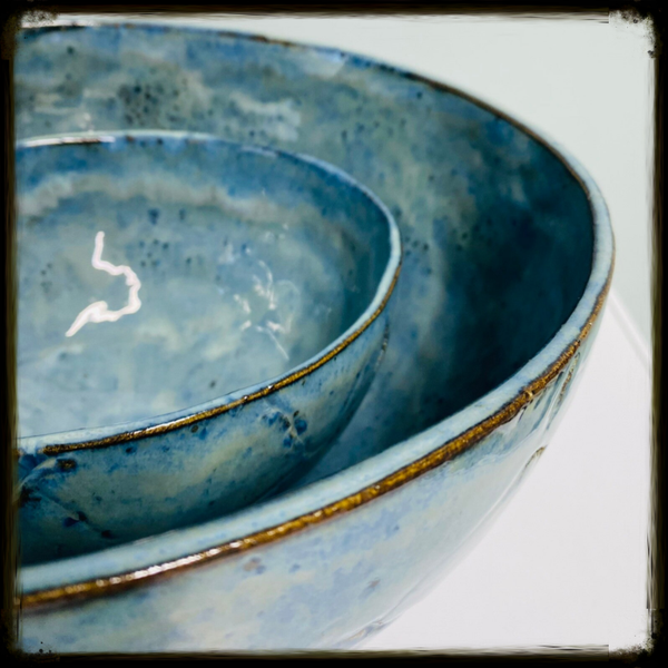Gemaakt in groffe kleimix en hemelsblauw gegelazuurd. Ideaal als slakom, fruitkom, pastbowl.