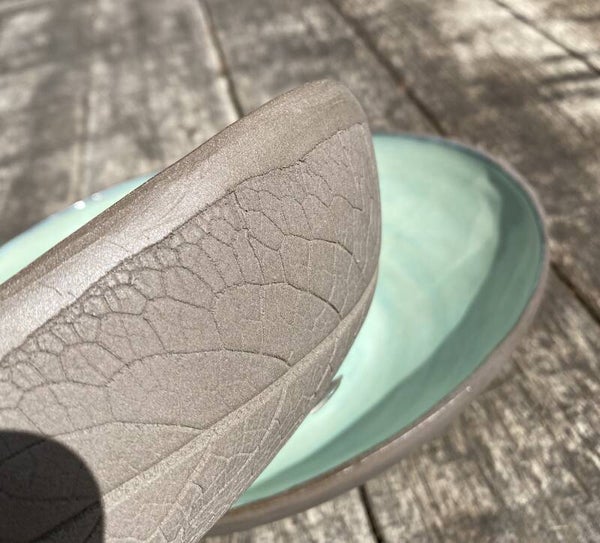 Set van 2 ovale kommen gemaakt in grijze klei. Buitenzijde niet gelazuurd met bladafdruk.