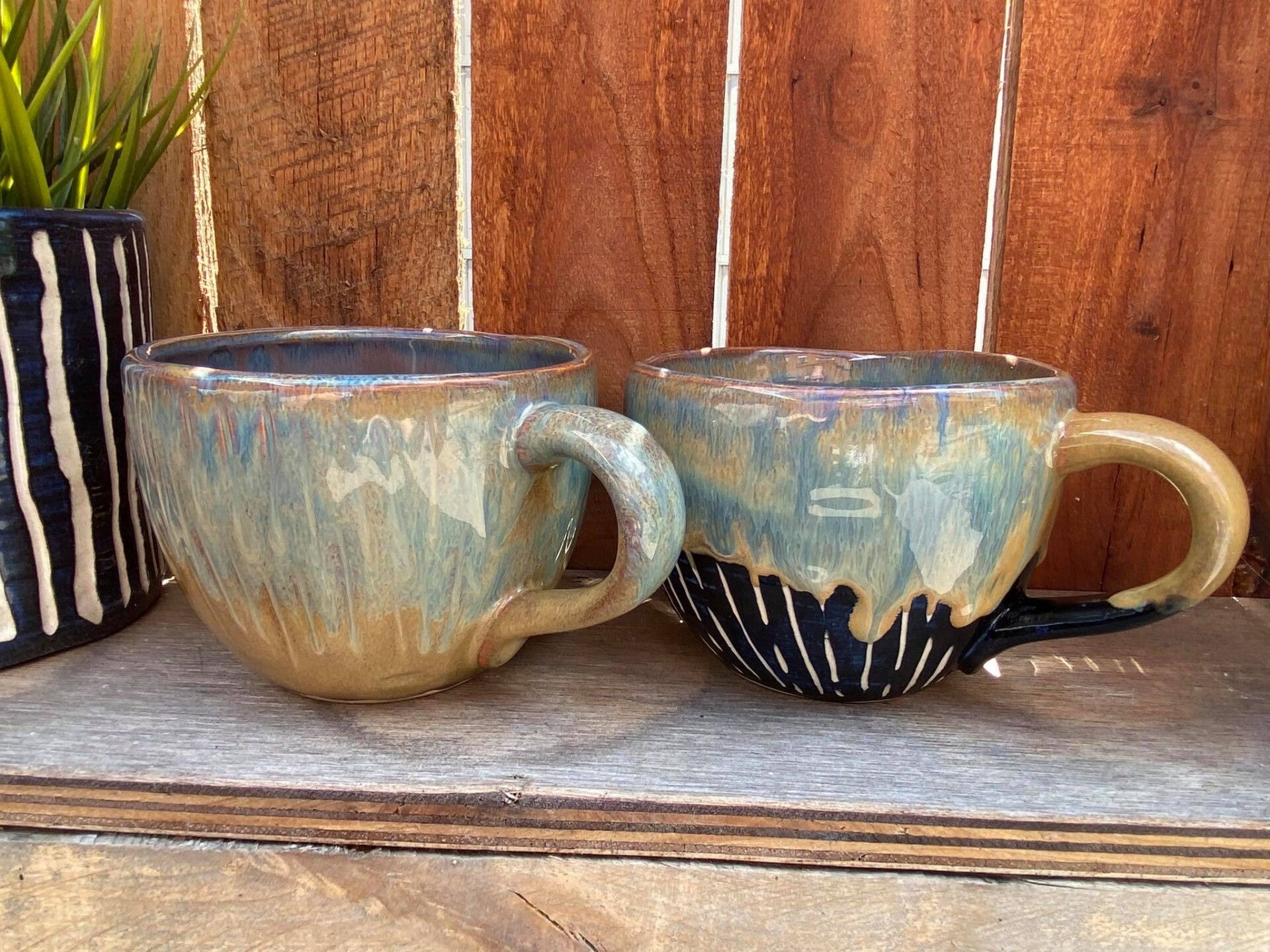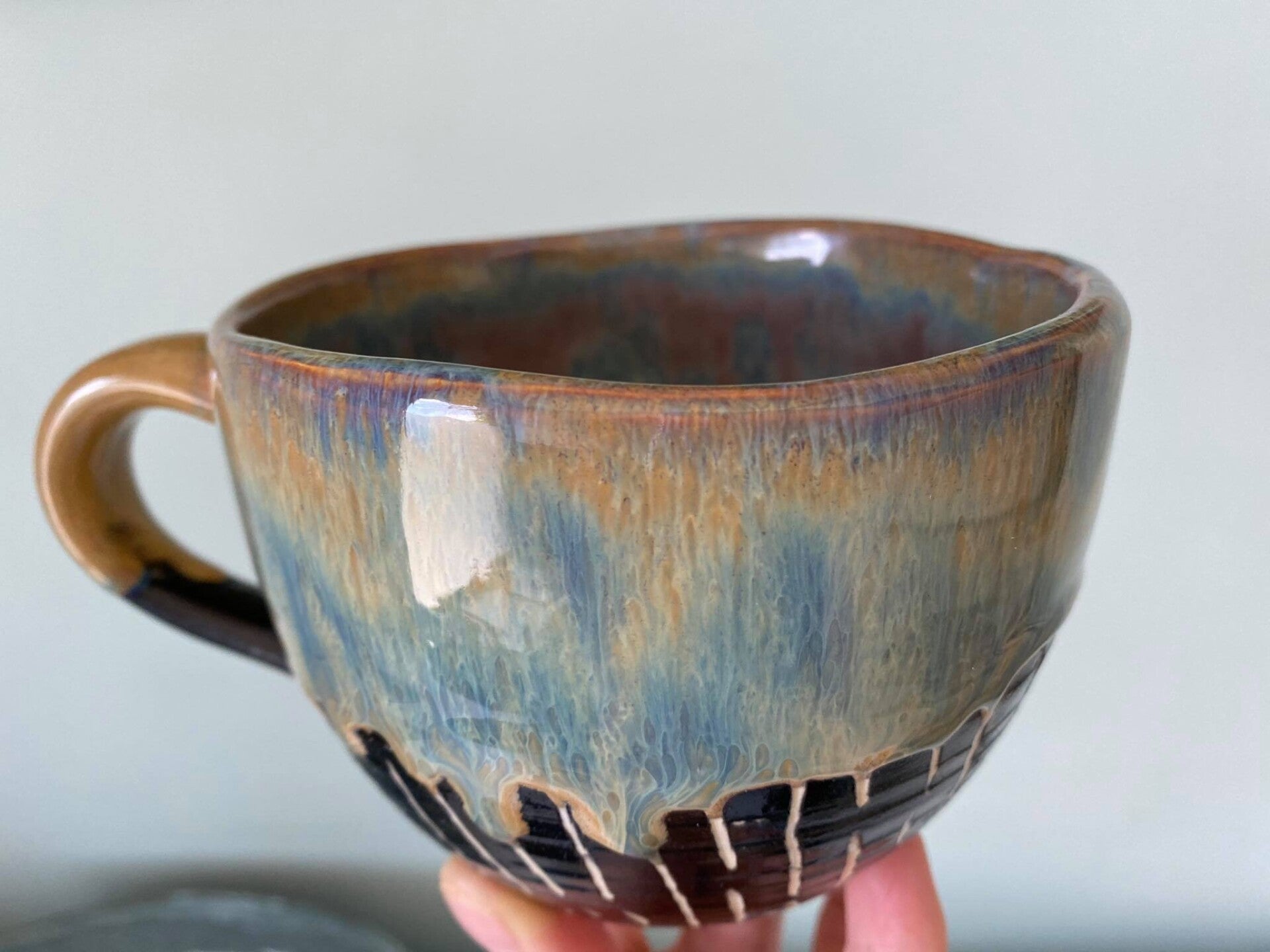 All-round-tas Gisèle in witte fijne klei, binnen en buiten geglazuurd in zwart/wit motief en oker/blauwe tinten. Ter herinnering van onze adoptie hond Muchu <3 - 300 ml inhoud