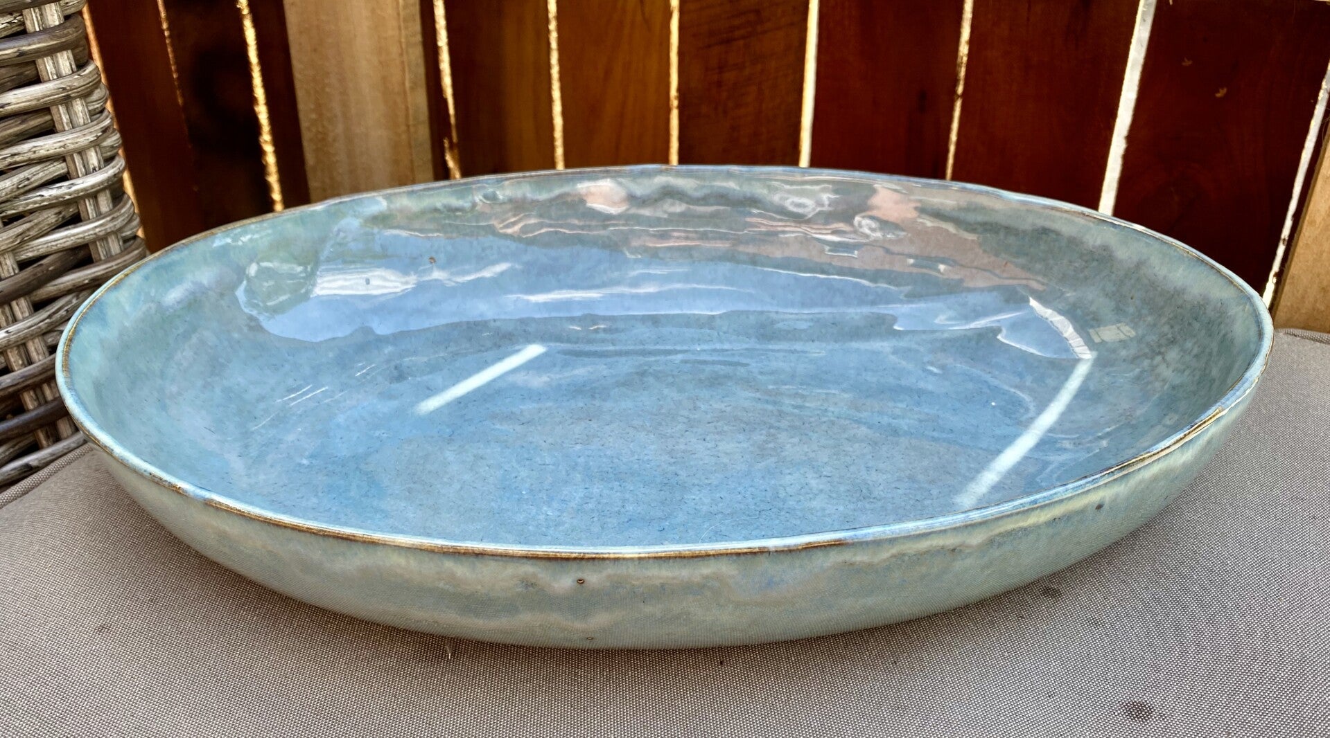 Ovale schotel in witte klei, binnen en buiten geglazuurd. 36 cm op 25 cm , 6 cm hoog. Ideaal voor slaatjes of als fruitschaal.