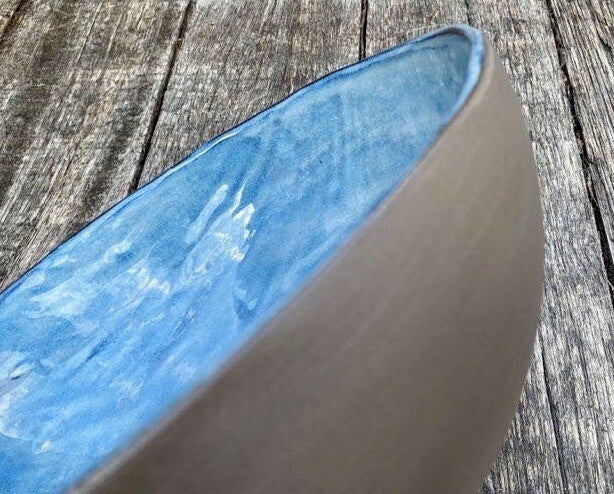 Diepe kom, 26 cm diameter. Gemaakt in grijze klei, binnenzijde is geglazuurd.