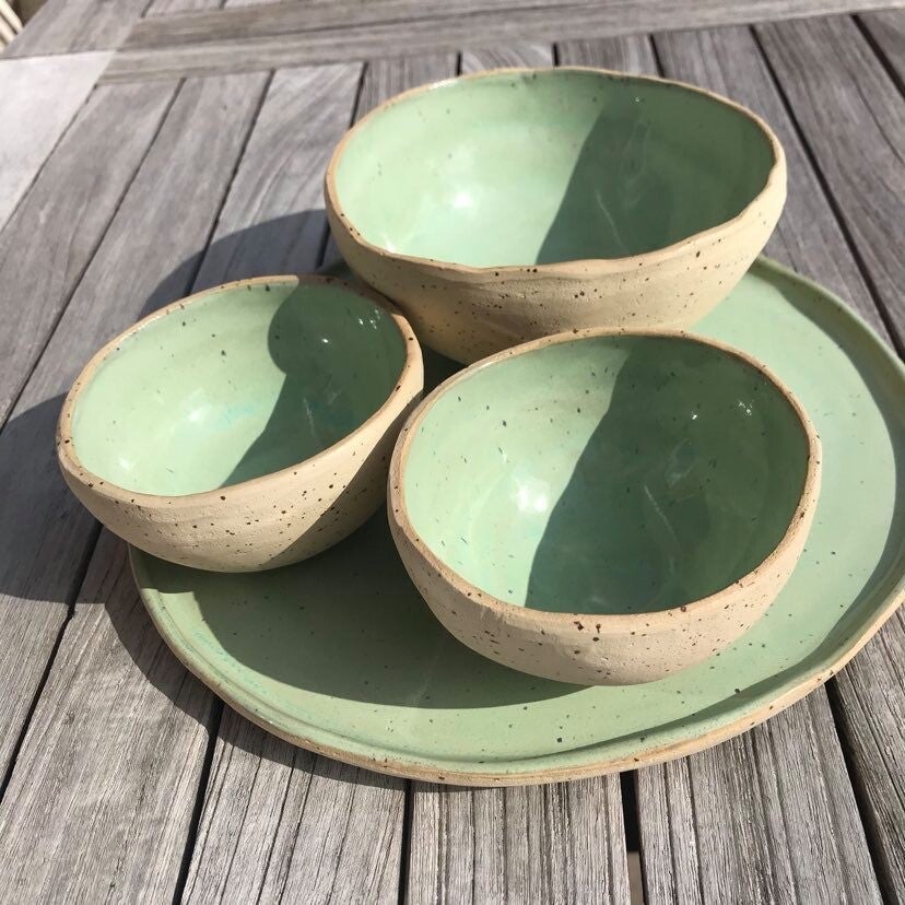 Leuke tapas-set bestaande uit 1 bord en 3 kommetjes. Gemaakt in witte spikkel klei.